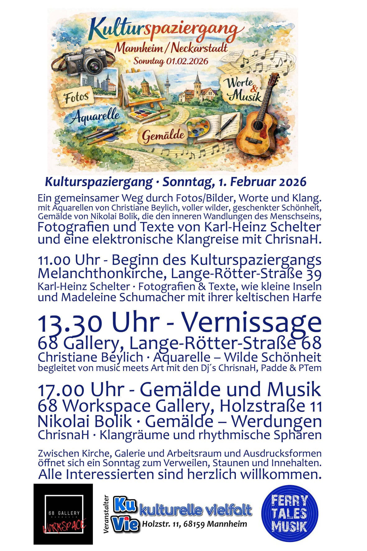 Am Sonntag, den 1. Februar 2026, lädt die Neckarstadt in Mannheim zu einem besonderen Kulturspaziergang ein. Unter dem Motto „Ein gemeinsamer Weg durch Fotos, Bilder, Worte und Klang“ verbindet die Veranstaltung verschiedene künstlerische Ausdrucksformen zu einem sinnlichen Gesamterlebnis – zwischen Kirche, Galerie und Arbeitsraum.